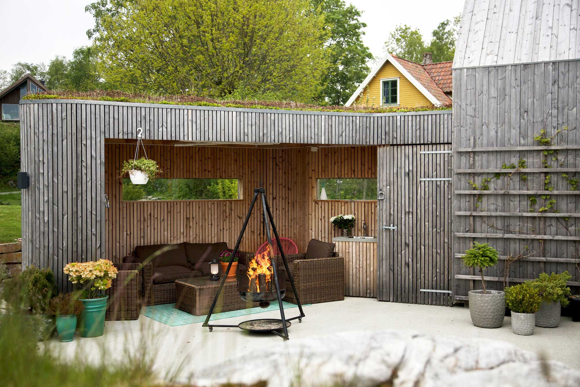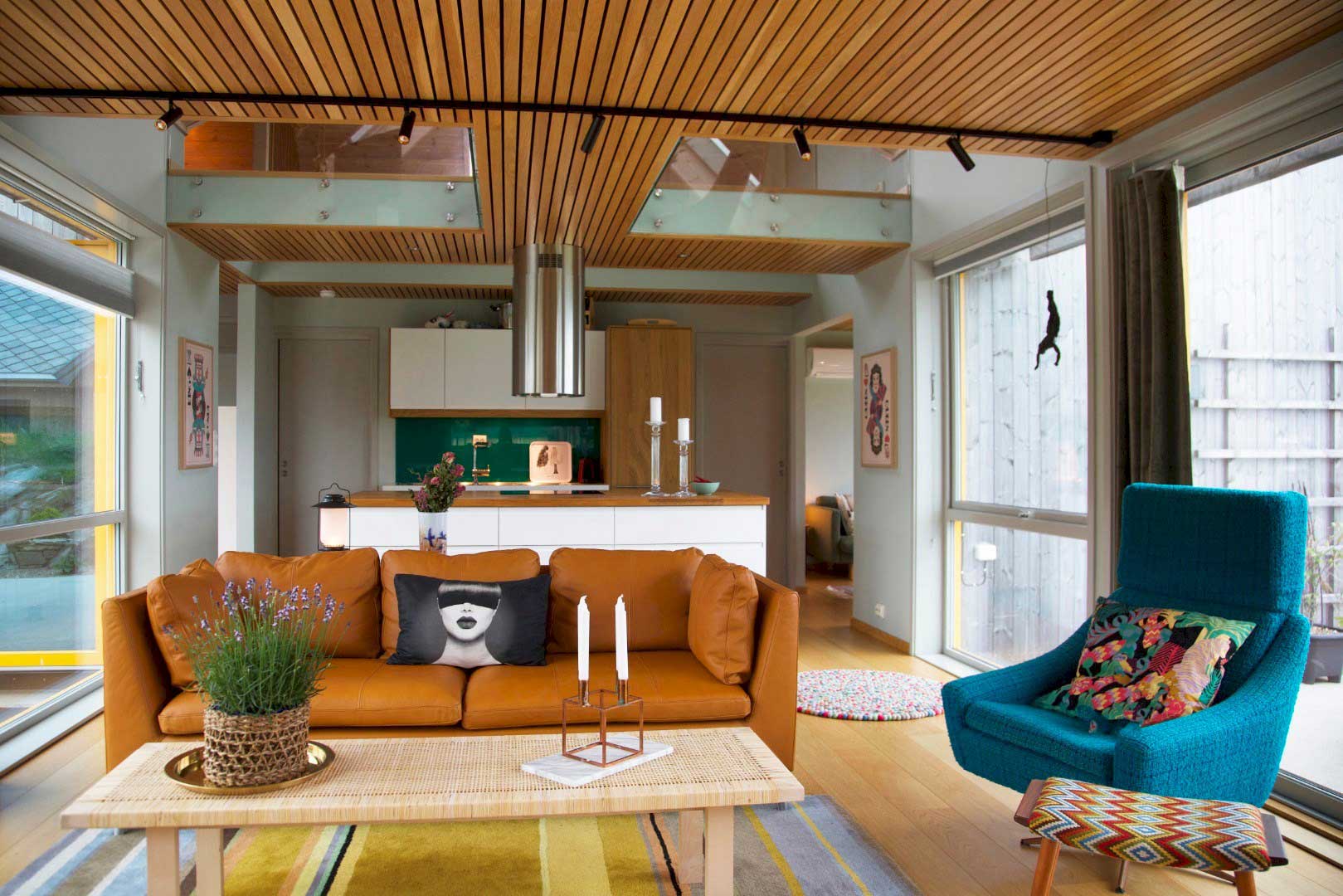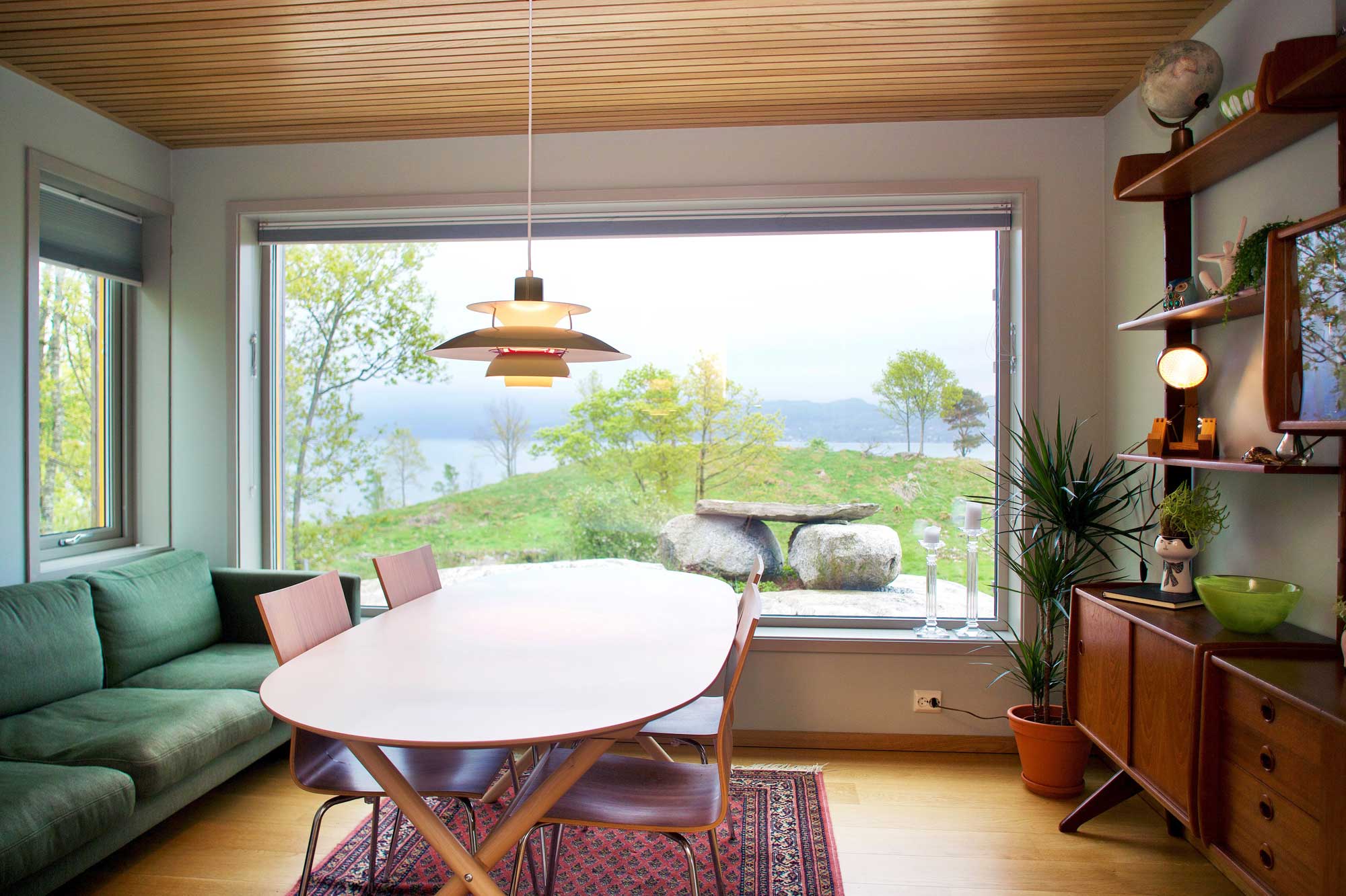 På begge sider av stue og kjøkken er det det skyvedører som kan åpnes helt opp og ute og inne glir over i hverandre. Familien er veldig fornøyd med de gule karmene på vinduer, skyvedører og balkongdør som er med på å gi hytta særpreg. Kilde: Hyttemagasinet