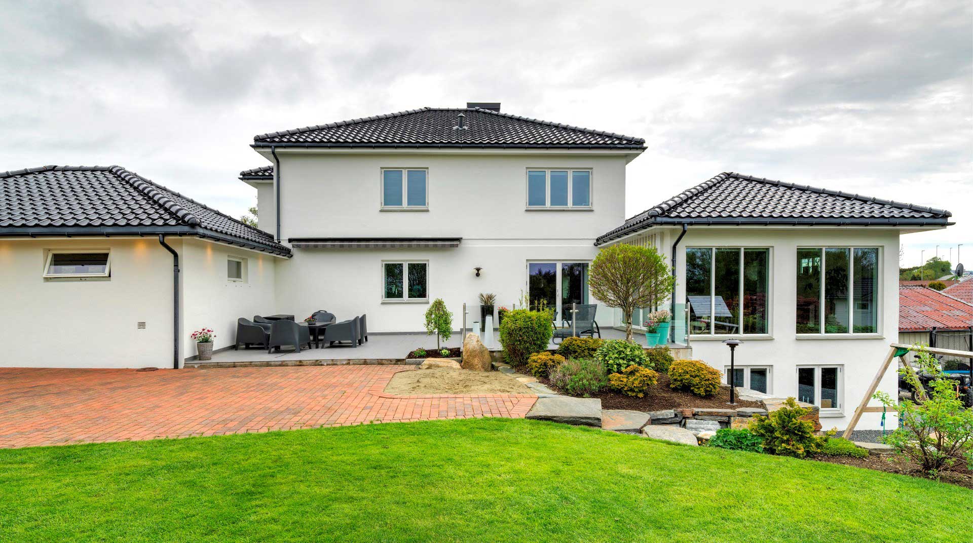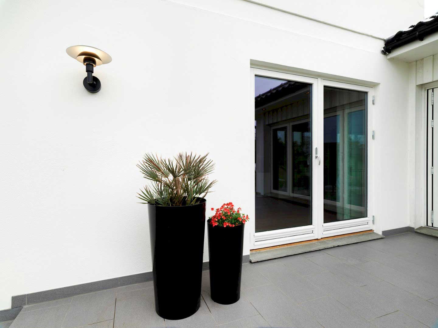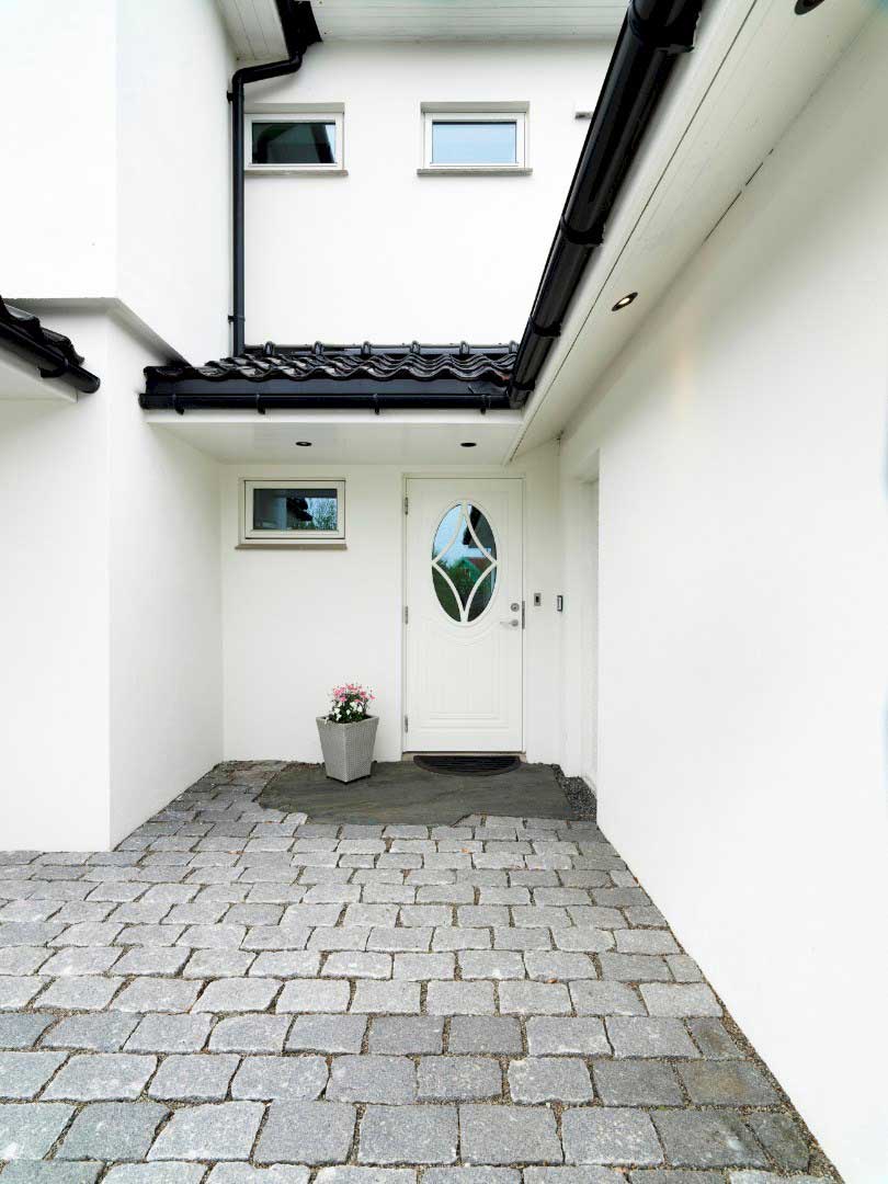 Valget av ytterdøren Solveig understøtter de fine linjene i huset. Store vindusflater er delt inn i mindre felt ved bruk av vindusposter. Utsikten og lysinngangen blir den samme, men inntrykket av de store vinduene avdempes.