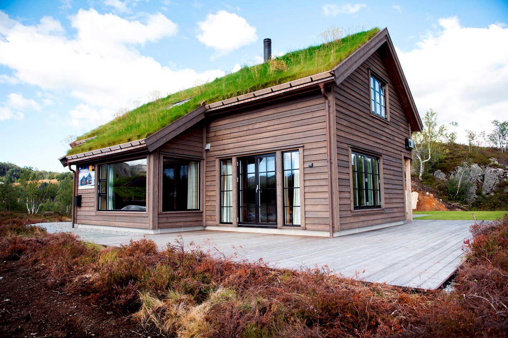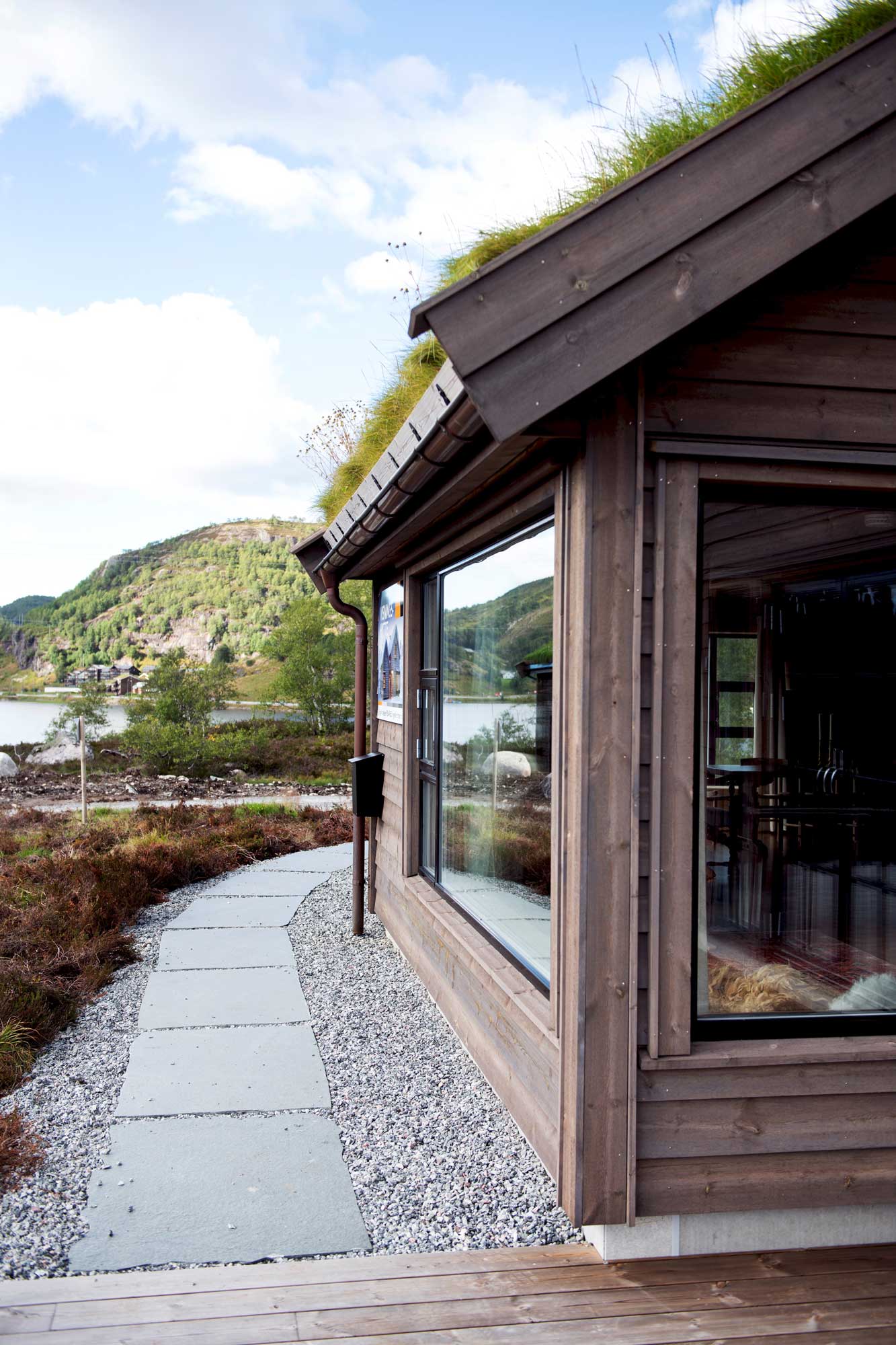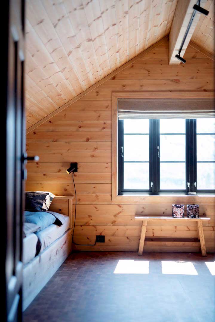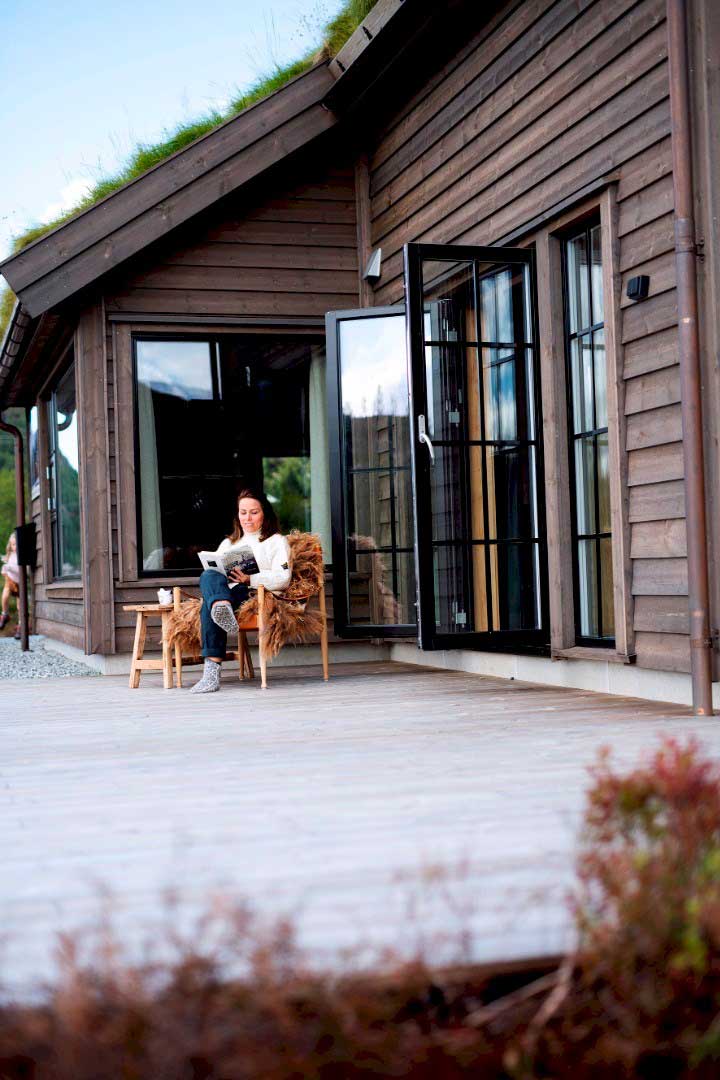 Dette er en stor og romslig familiehytte. Her har vi levert sidehengslede vinduer og dører fra produktserien Gilje Basic. Vinduene har 25mm klipssprosse i aluminium utvendig. Klipssprossen er enkel å ta av og sette på igjen når du vasker vinduene. Vinduene er malt i sort NCS S 9000N.